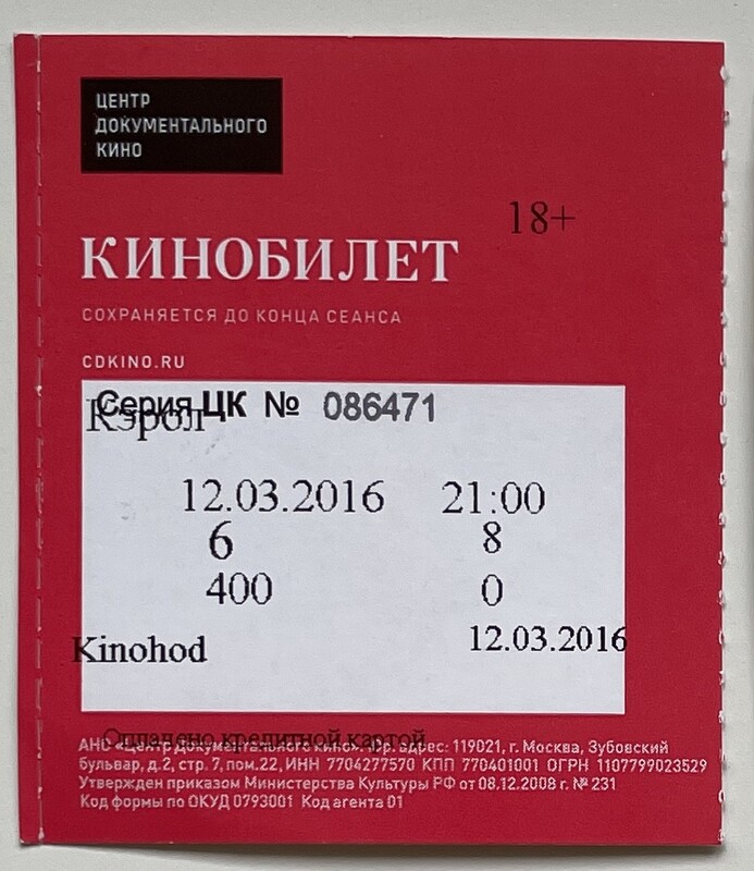 Center for Documentary Cinema, “Кэрол / Carol,” fishtickets, accessed March 4, 2026, http://pilotfish.info/items/show/232.