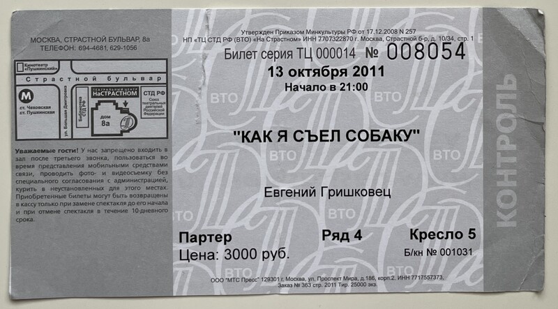 Theatre Center "Na Strastnom", “Как я съел собаку / How I Ate a Dog,” fishtickets, accessed March 4, 2026, http://pilotfish.info/items/show/260.