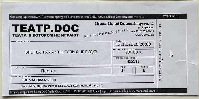 Teatr.doc, “Вне театра / А что, если я не буду? / Outside the Theater / What if I don't?,” fishtickets, accessed March 4, 2026, http://pilotfish.info/items/show/303.