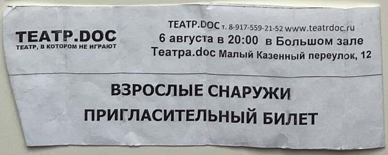 Teatr.doc, “Взрослые снаружи / Adults outside,” fishtickets, accessed March 4, 2026, http://pilotfish.info/items/show/306.
