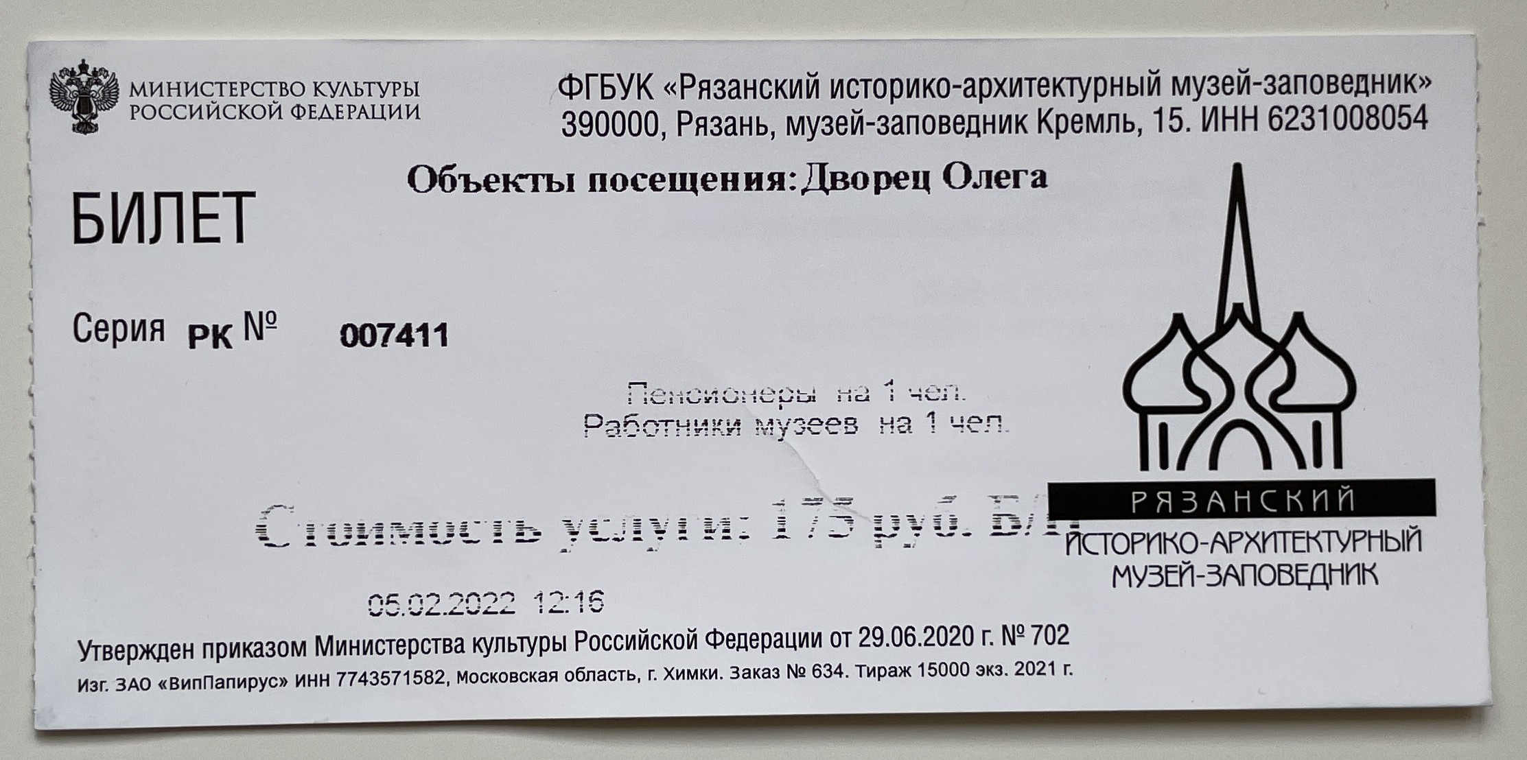Ticket for 2 persons (1 pensioner and 1 museum employee), 175 Russian rubles