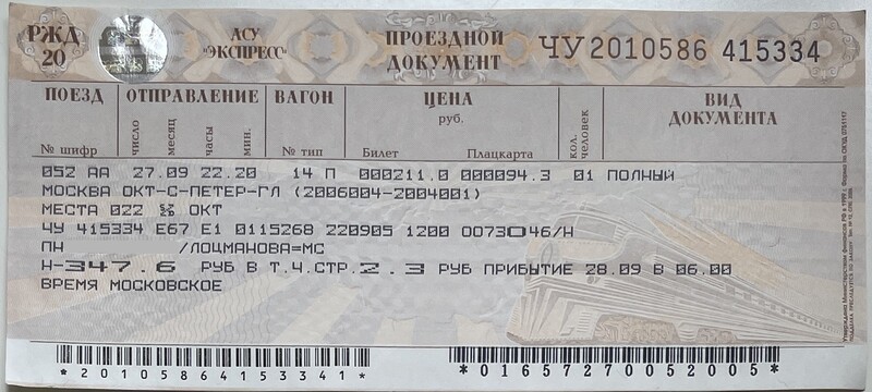 Russian Railways, “Поезд Москва—Санкт-Петербург / Moscow—Saint Petersburg Train,” fishtickets, accessed March 4, 2026, http://pilotfish.info/items/show/350.
