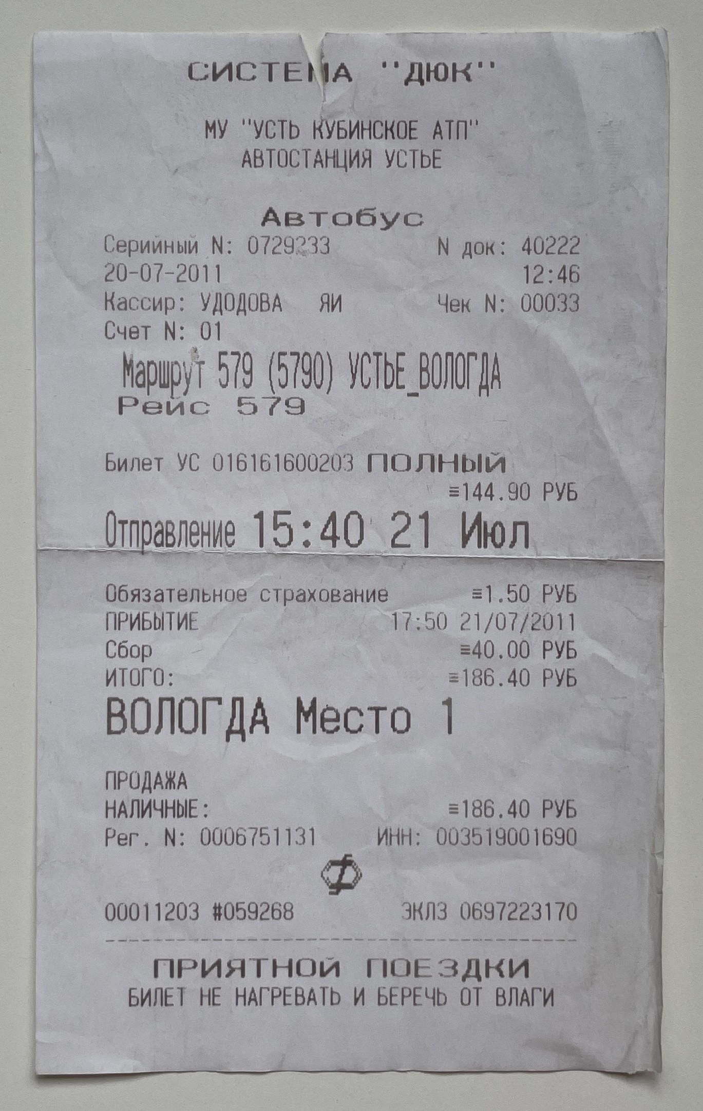 Ust-Kubinskoye Transport Company, “Автобус Устье—Вологда / Ustye—Vologda Bus,” fishtickets, accessed March 4, 2026, http://pilotfish.info/items/show/385.
