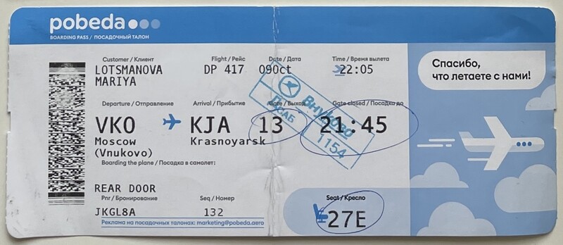 Pobeda, “Moscow—Krasnoyarsk Flight,” fishtickets, accessed March 4, 2026, http://pilotfish.info/items/show/403.