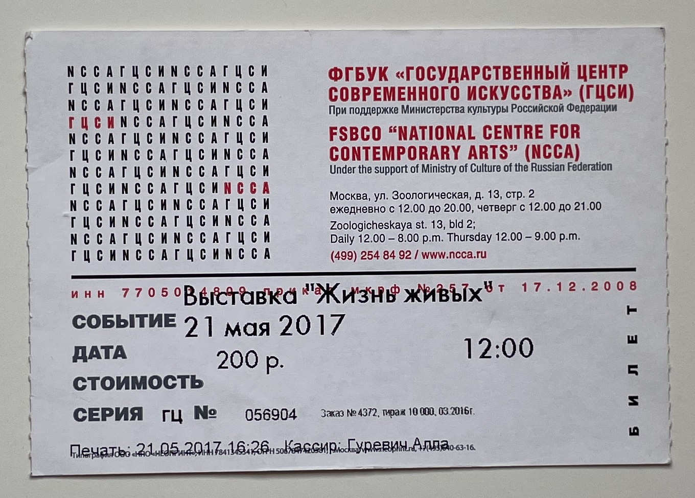 National Center for Contemporary Arts, “Жизнь живых / Life of Living Beings,” fishtickets, accessed January 10, 2026, http://www.pilotfish.info/items/show/109.