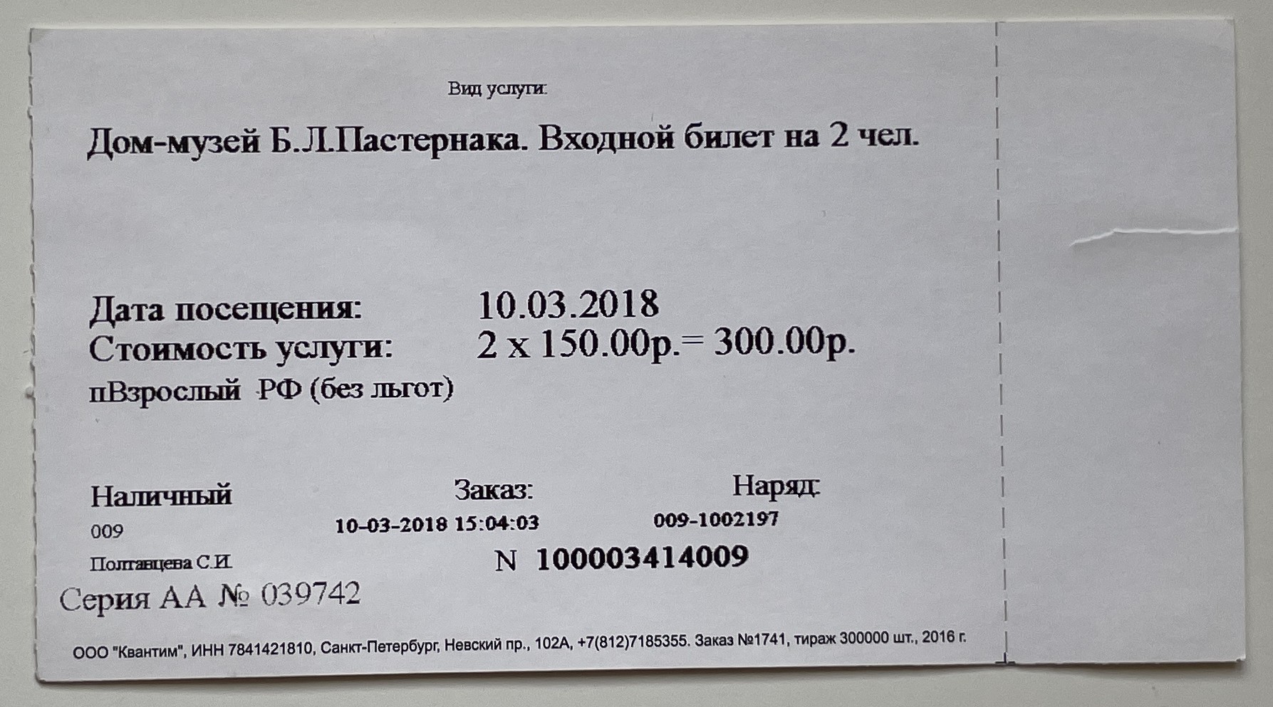 - Regular ticket for 2 persons, 300 Russian rubles