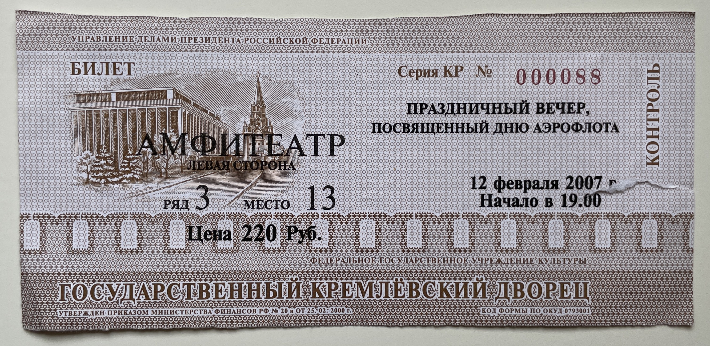 State Kremlin Palace, “Праздничный вечер, посвященный Дню Аэрофлота / Celebration performance dedicated to Aeroflot Day,” fishtickets, accessed January 8, 2026, http://www.pilotfish.info/items/show/142.