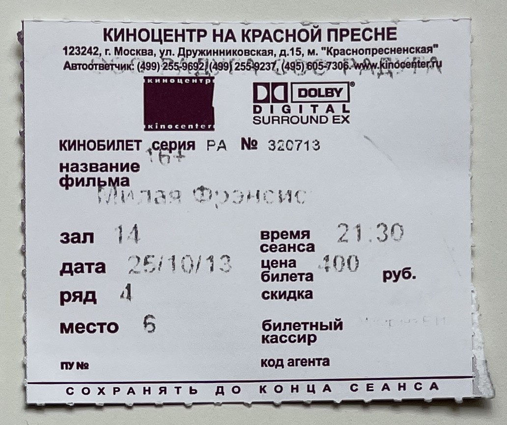 Cinema Center on Krasnaya Presnya, “Милая Фрэнсис / Frances Ha,” fishtickets, accessed January 8, 2026, http://www.pilotfish.info/items/show/162.