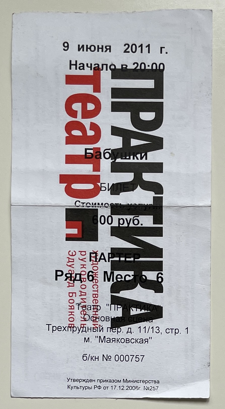 Praktika Theater, “Бабушки / Babushki,” fishtickets, accessed January 9, 2026, http://www.pilotfish.info/items/show/37.