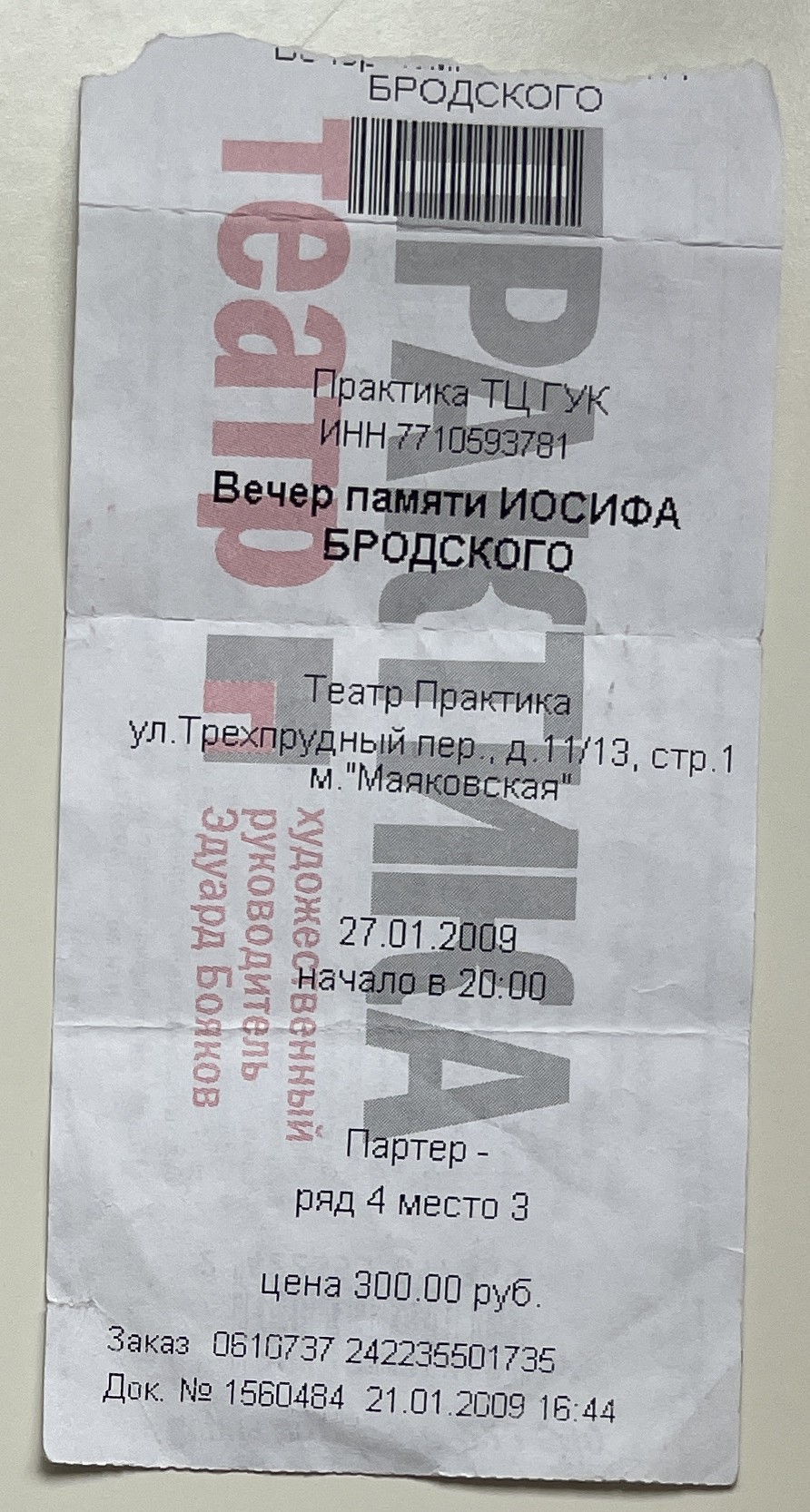 Praktika Theater, “Вечер памяти Иосифа Бродского / In memoriam Joseph Brodsky,” fishtickets, accessed January 9, 2026, http://www.pilotfish.info/items/show/38.