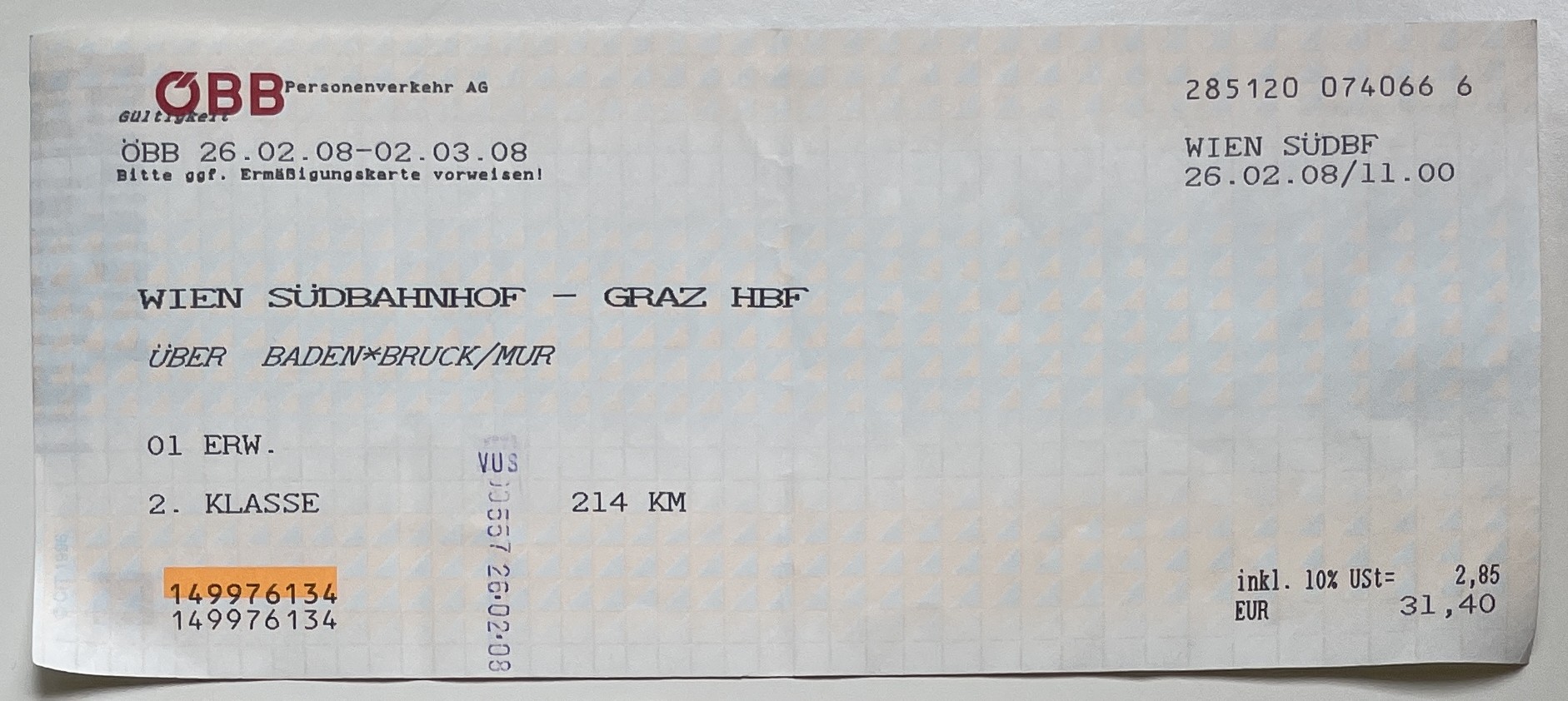 Train ticket, 2nd class, 31,40 Euro
