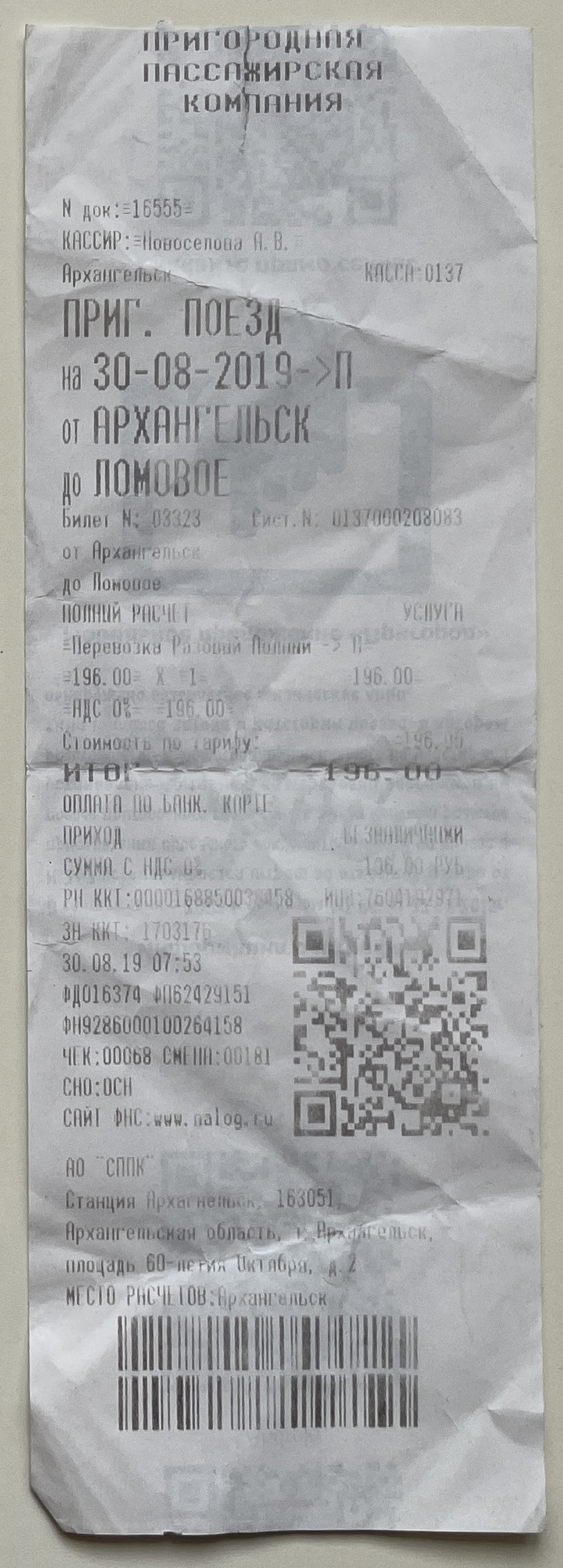 Northern Suburban Passenger Company, “Электричка Архангельск—Ломовое / Arkhangelsk—Lomovoe Suburban Train,” fishtickets, accessed February 22, 2026, http://www.pilotfish.info/items/show/449.