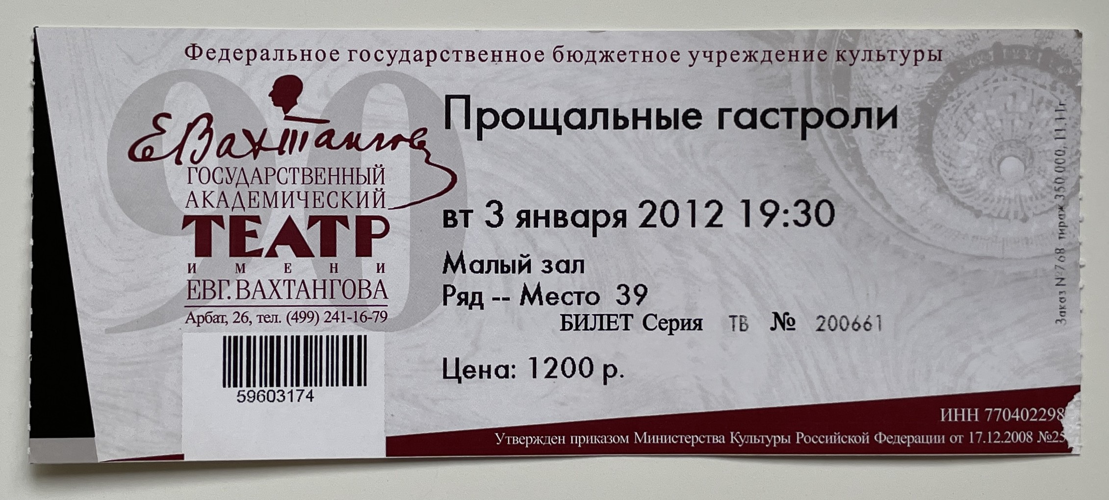 Vakhtangov Theater, “Прощальные гастроли / Farewell Tour,” fishtickets, accessed January 8, 2026, http://www.pilotfish.info/items/show/57.