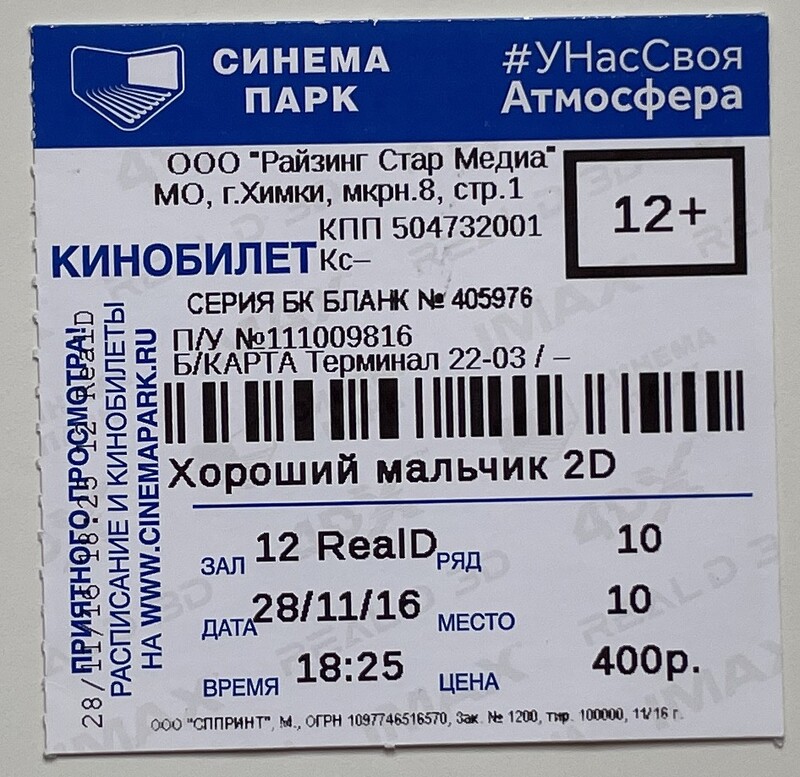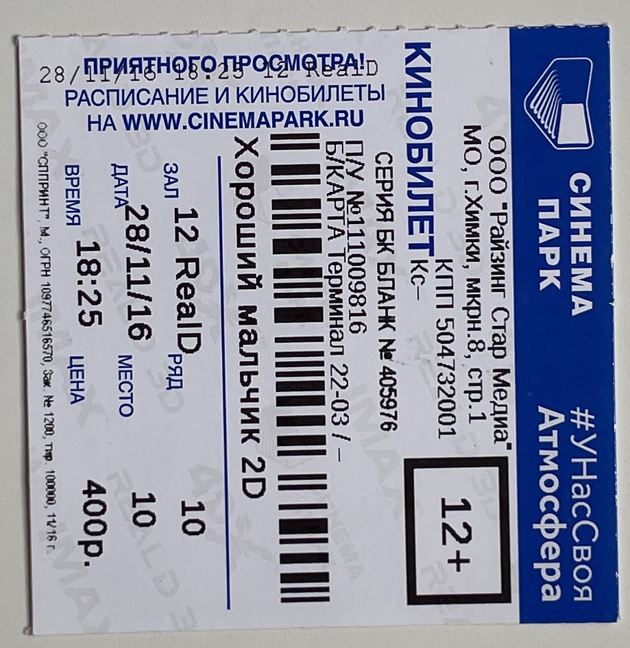 Cinema Park movie theater, “Хороший мальчик / A Good Boy,” fishtickets, accessed December 16, 2025, https://pilotfish.info/items/show/107.