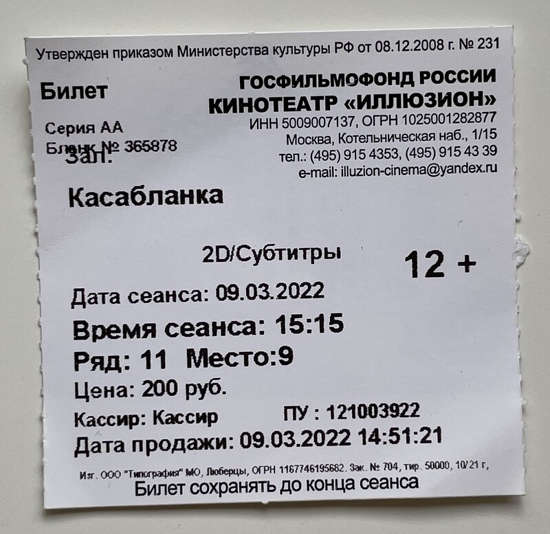 Illusion movie theater, “Касабланка / Casablanca,” fishtickets, accessed December 13, 2025, https://pilotfish.info/items/show/13.