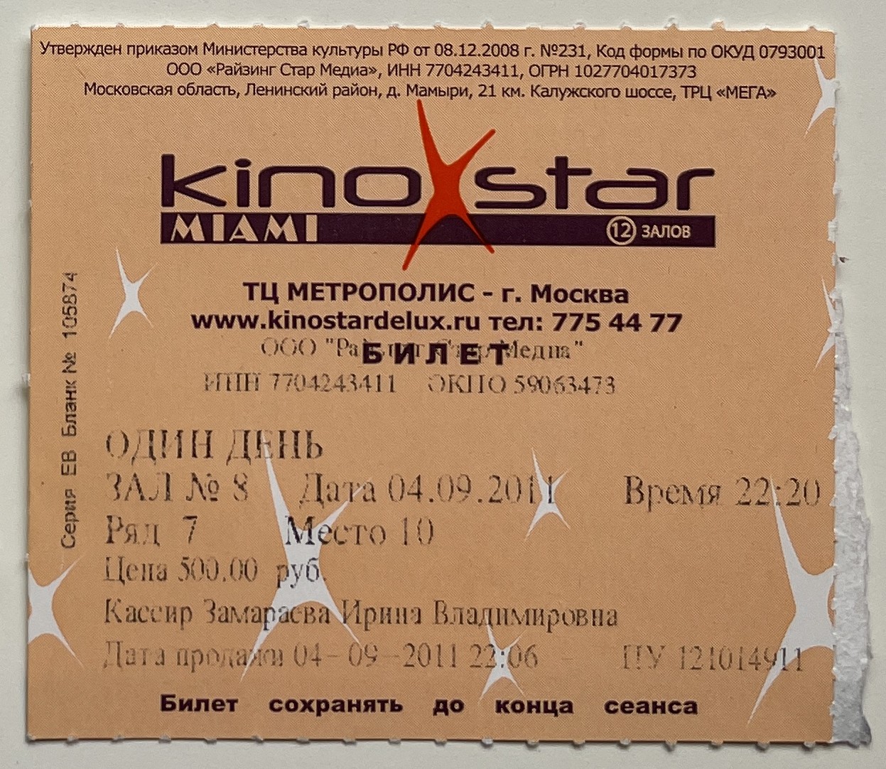 Kinostar Miami, “Один день / One Day,” fishtickets, accessed December 17, 2025, https://pilotfish.info/items/show/159.