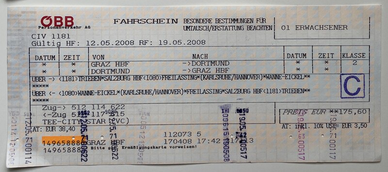 Austrian Federal Railways / Österreichische Bundesbahnen, “Graz—Dortmund—Graz,” fishtickets, accessed December 13, 2025, https://pilotfish.info/items/show/42.